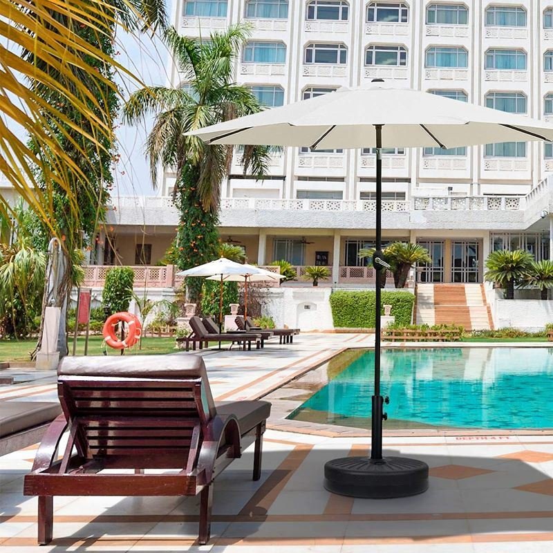 Made of durable HDPE material; all weather resistant; the steel pipe is galvanized and would not be corroded easily. It has good solidity and would not let the umbrella tilt easily.